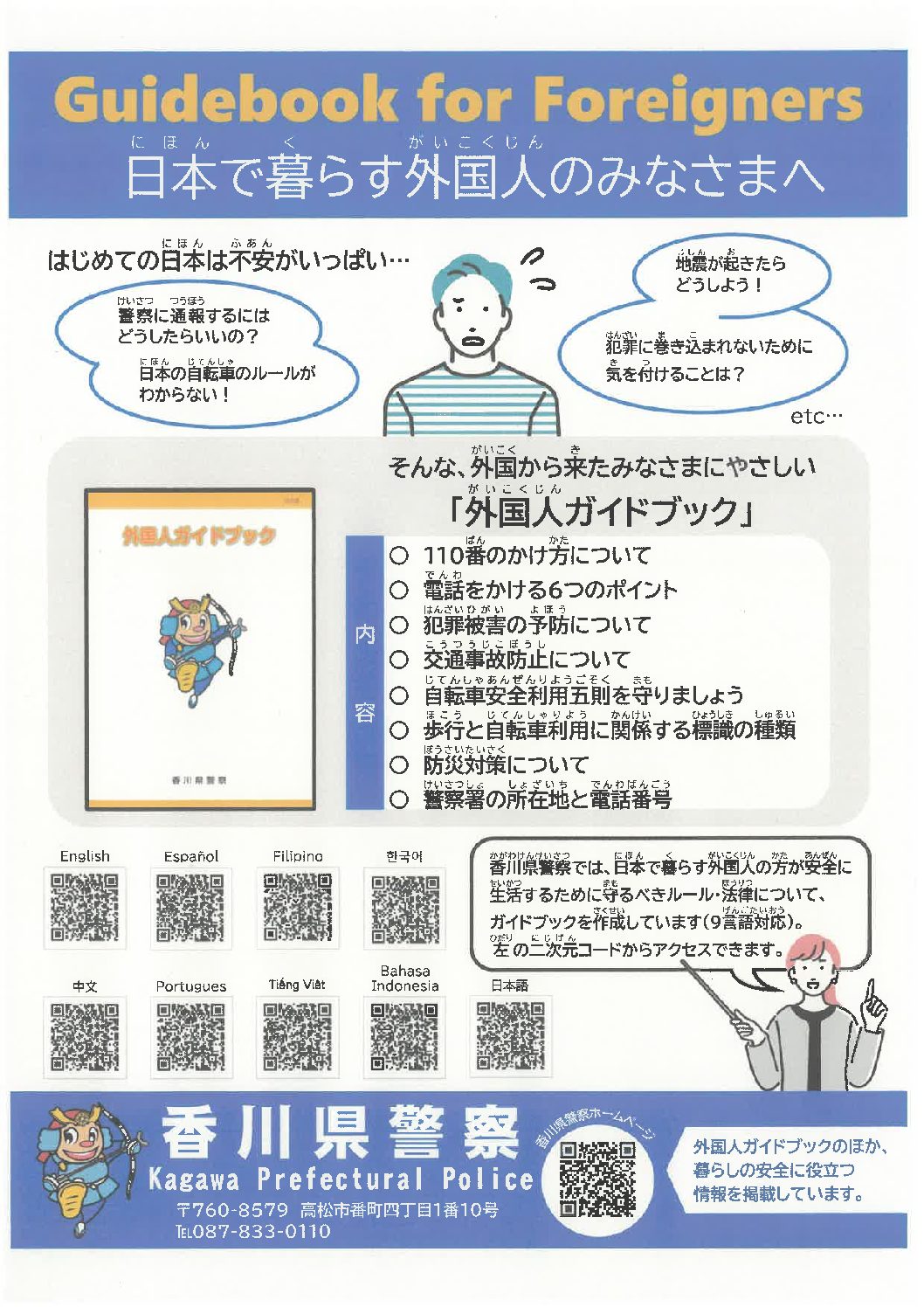 外国人ガイドブック 2025.11.20 協同組合クローバー › フォーラム › クローバーの掲示板 › 外国人ガイドブック このトピックには1件の返信、1人の参加者があり、最後にcloverにより3ヶ月前に更新されました。 1件の返信スレッドを表示中 投稿者 投稿 2025年11月20日 4:43 PM #3658 返信 cloverキーマスター 坂出警察から外国人ガイドブックをいただきましたので掲示します。 (けいさつから、がいこくじんガイドブックをいただきました) ないようは ・110ばん けいさつへのでんわのかけかた ・でんわをかけるポイント ・はんざいひがいのよぼう ・こうつうじこぼうし ・じてんしゃのあんぜんりよう など Attachments:c3d61b9e597b8438f037dd7512452547.pdf 2025年11月20日 4:44 PM #3660 返信 cloverキーマスター けいさつから こうつうあんぜんニュースをいただきました。 Attachments:c92b859bbc71333d10a743be72ba8fd5.pdf 投稿者 投稿 1件の返信スレッドを表示中 返信先: 外国人ガイドブック あなたの情報: お名前 (必須) メール (非公開) (必須): ウェブサイト: キャンセル 送信